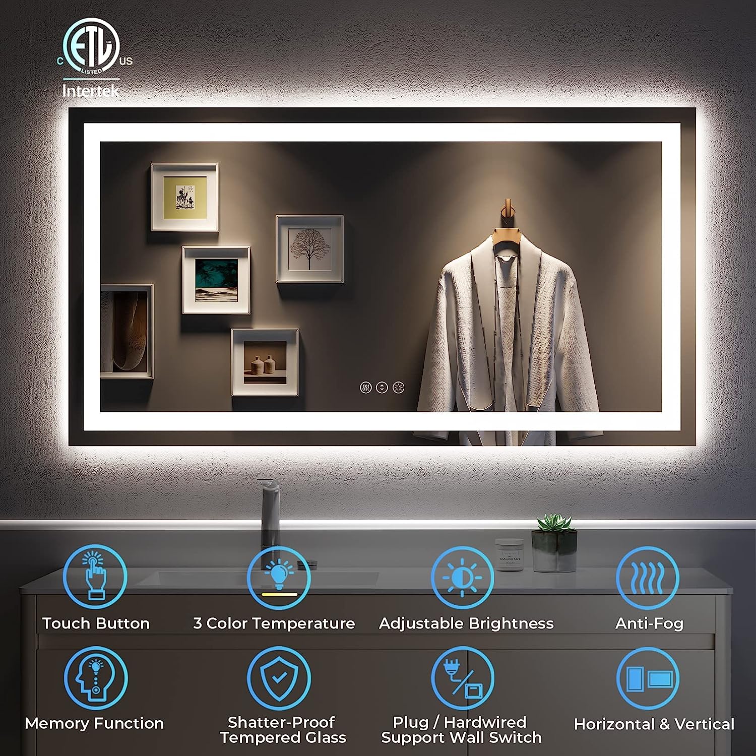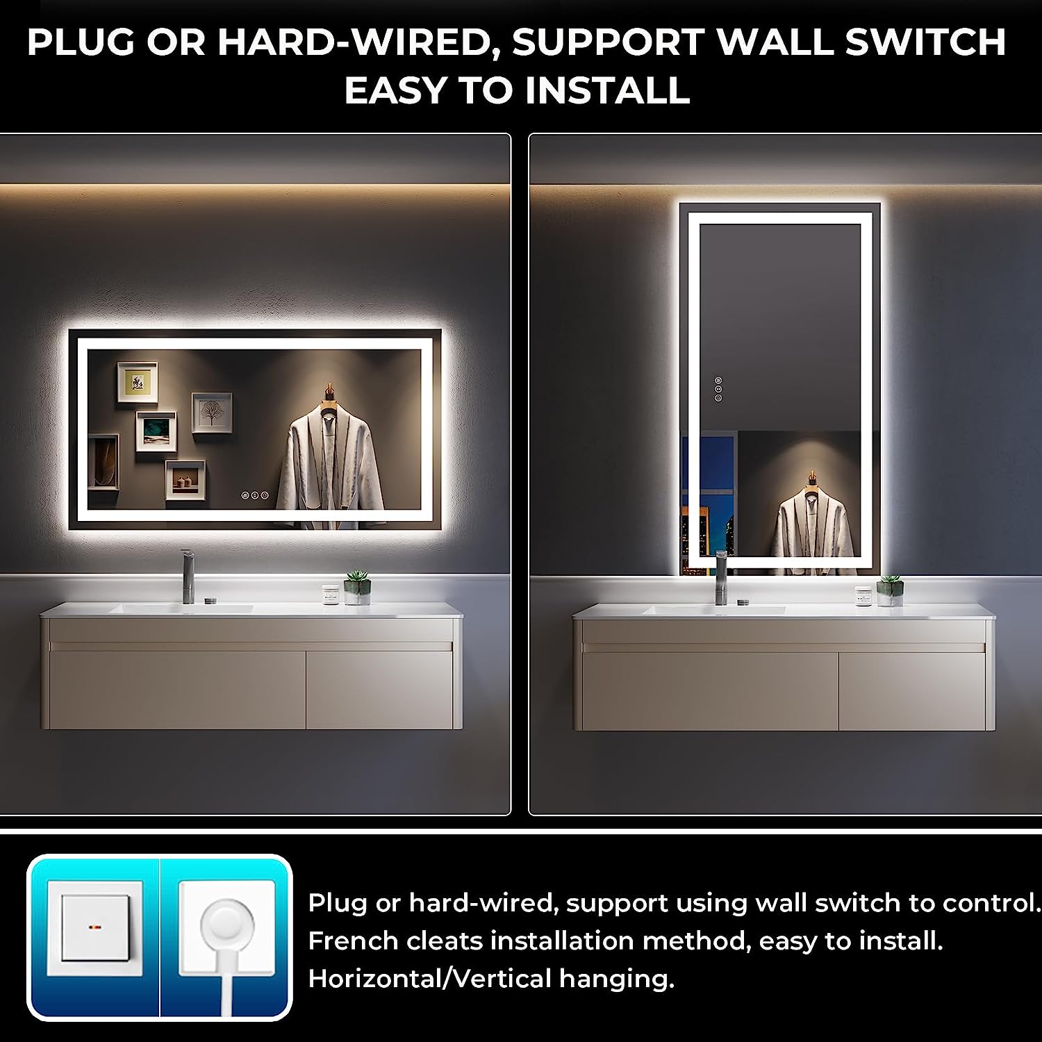 - π§ Flexible Installation - Our LED bathroom mirror comes with two power supply options: plug-in or hardwired. It can be easily controlled using a wall switch for both the lights and anti-fog function. The package includes French cleats for effortless installation, and the mirror can be hung horizontally or vertically to suit your interior design.