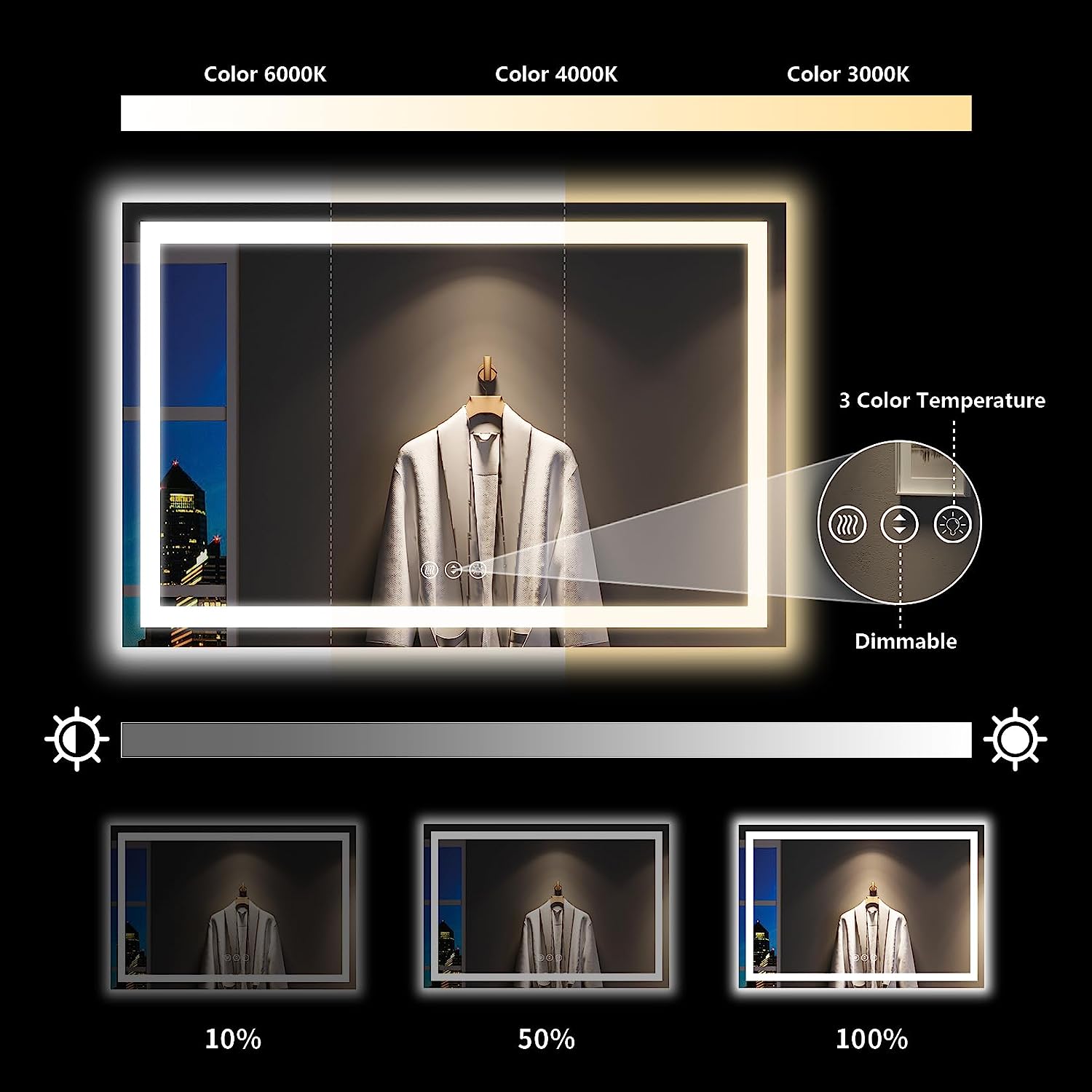 - π‘ Customizable Lighting - Featuring three touch buttons, you can easily adjust the mirror's lighting according to your needs. Short press the 'Light' button to switch between white, natural, or warm light. Long press the 'Brightness' button to adjust the brightness level from 10% to 100%. It even has a smart memory function, which retains your previous settings even after being turned off.