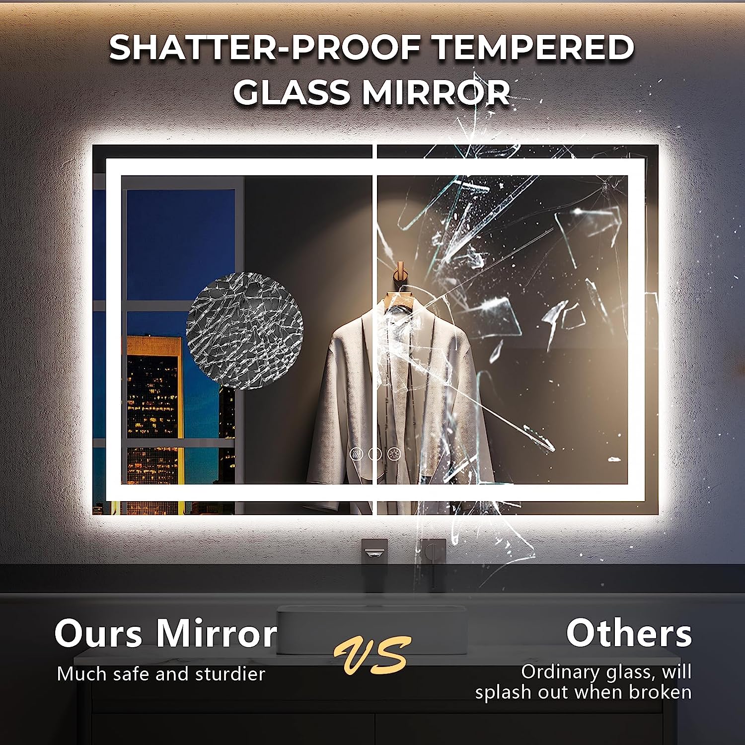 - π‘Shatter-Proof & Waterproof - Crafted from high-quality 5mm shatter-proof tempered glass, our mirror is designed to withstand wear and tear. It won't break easily, and even if it does, it won't shatter into pieces for your safety. The IP54 waterproof rating ensures it's safe to use even in wet bathrooms.