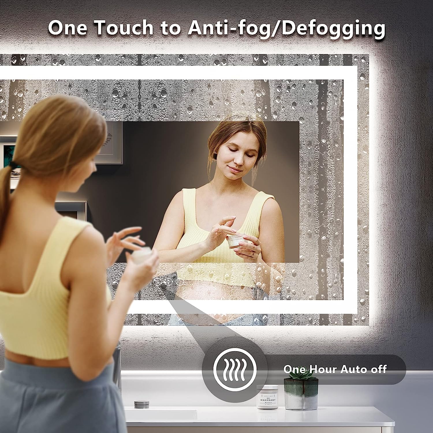 - π§ Effective Anti-Fog Function - Say goodbye to foggy mirrors post-shower. Our bathroom mirror comes with an intelligent anti-fog button that can prevent fog formation or swiftly remove water vapor, ensuring a clear reflection at all times. The defogger auto shuts off after 1 hour to prevent overheating, saving energy without compromising functionality.