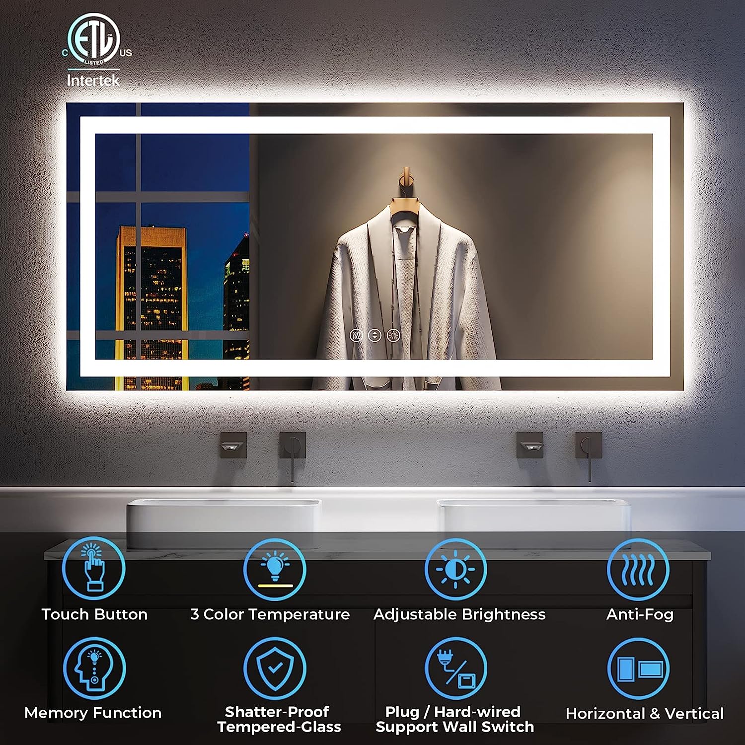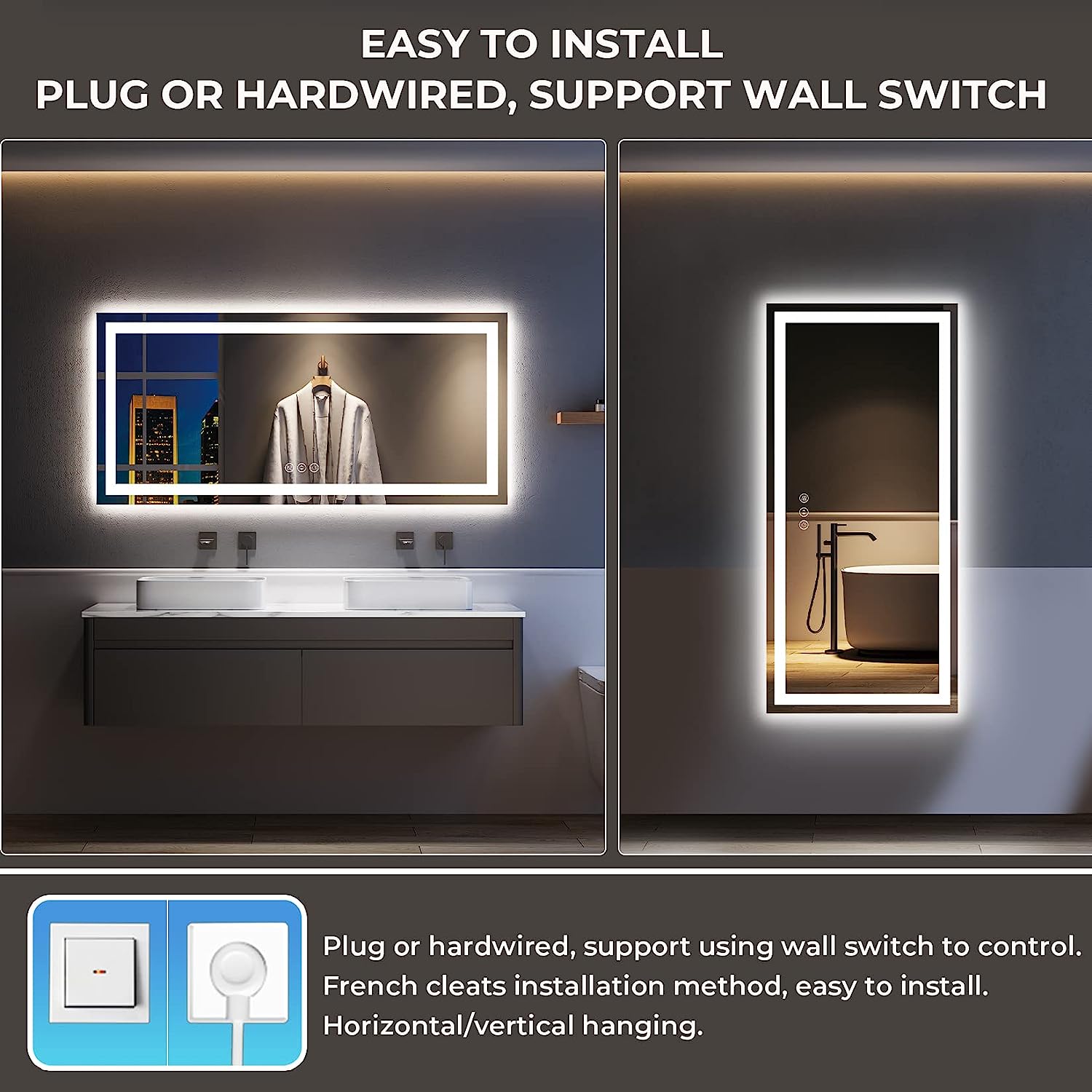 - π§ Flexible Installation - Our LED bathroom mirror comes with two power supply options: plug-in or hardwired. It can be easily controlled using a wall switch for both the lights and anti-fog function. The package includes French cleats for effortless installation, and the mirror can be hung horizontally or vertically to suit your interior design.