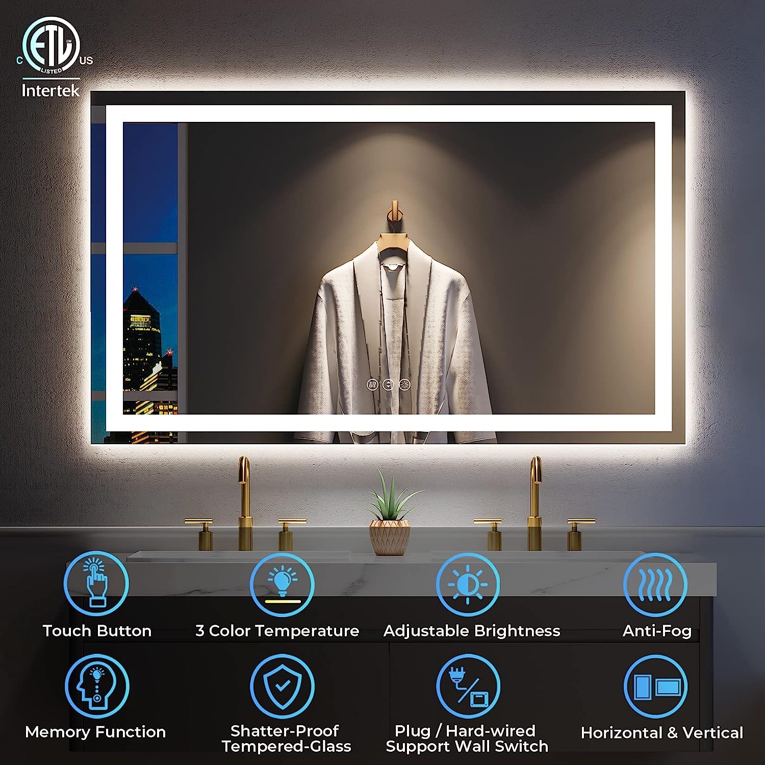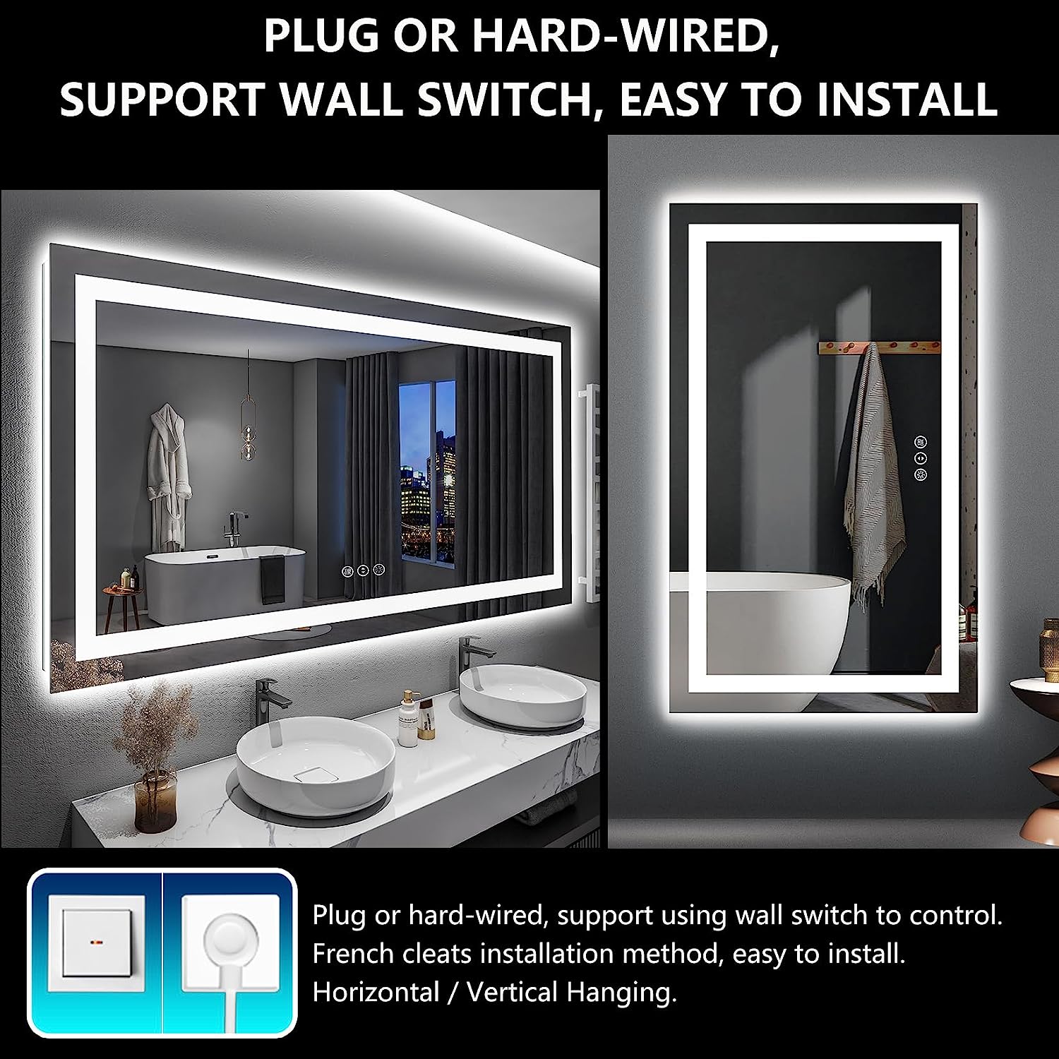 - π§ Flexible Installation - Our LED bathroom mirror comes with two power supply options: plug-in or hardwired. It can be easily controlled using a wall switch for both the lights and anti-fog function. The package includes French cleats for effortless installation, and the mirror can be hung horizontally or vertically to suit your interior design.