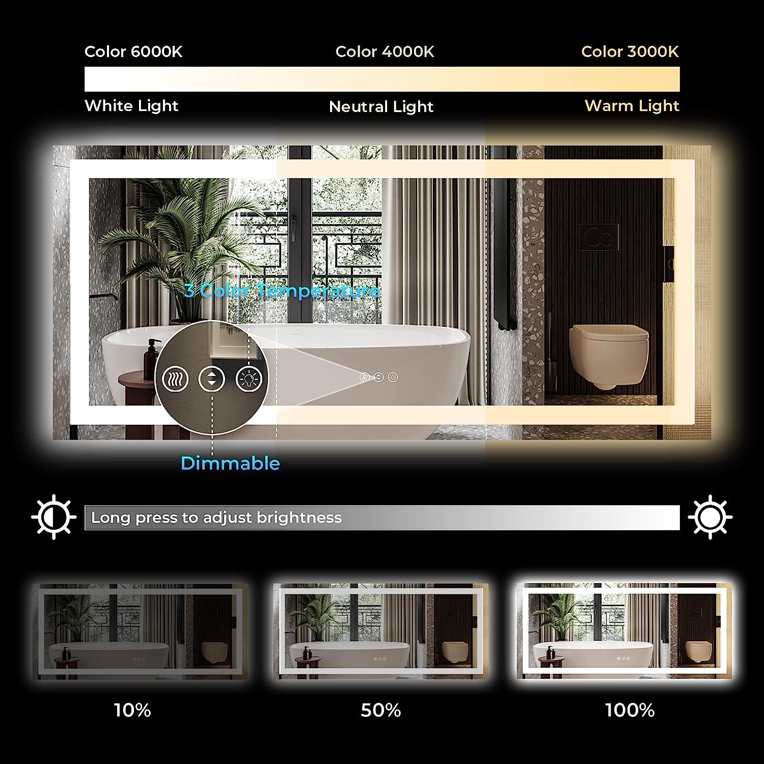 - π‘ Customizable Lighting - Featuring three touch buttons, you can easily adjust the mirror's lighting according to your needs. Short press the 'Light' button to switch between white, natural, or warm light. Long press the 'Brightness' button to adjust the brightness level from 10% to 100%. It even has a smart memory function, which retains your previous settings even after being turned off.