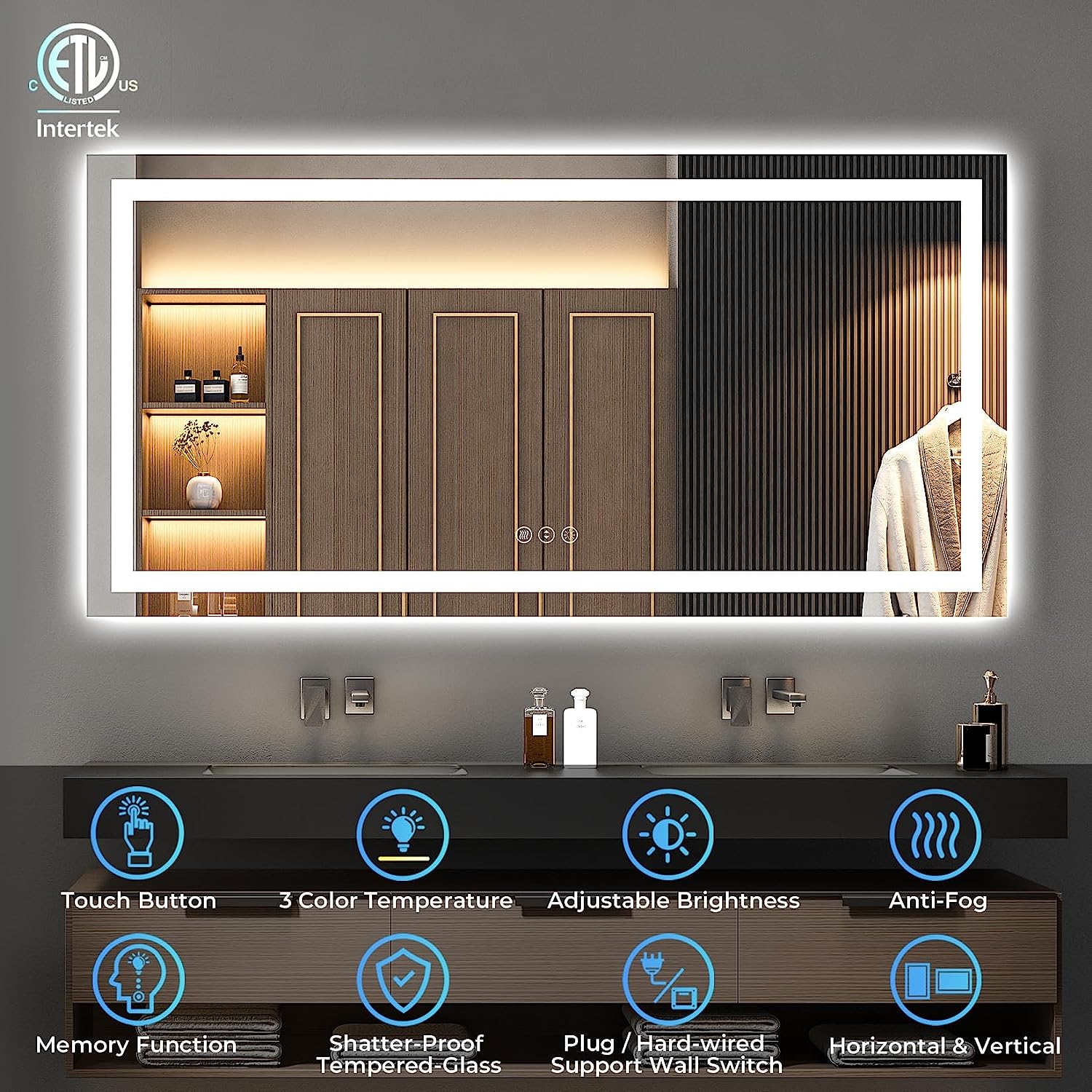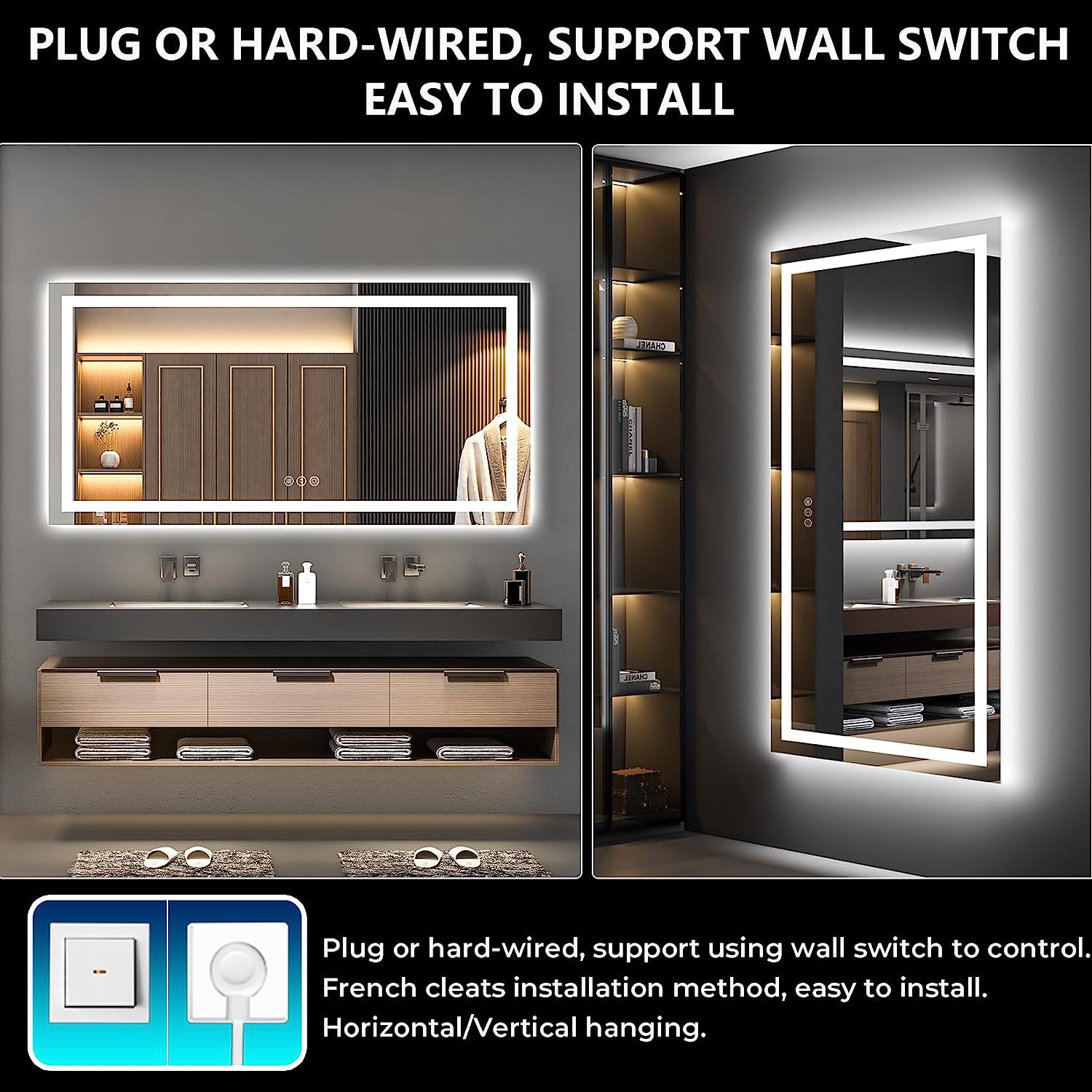 - π§ Flexible Installation - Our LED bathroom mirror comes with two power supply options: plug-in or hardwired. It can be easily controlled using a wall switch for both the lights and anti-fog function. The package includes French cleats for effortless installation, and the mirror can be hung horizontally or vertically to suit your interior design.