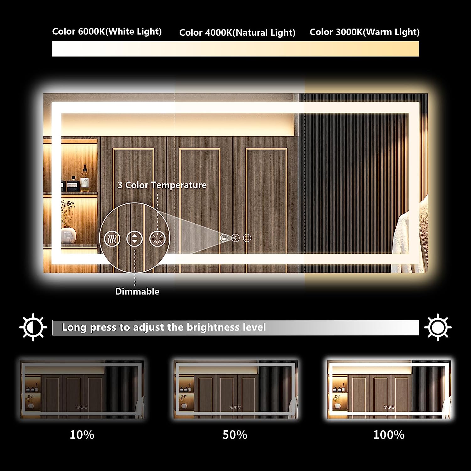 - π‘ Customizable Lighting - Featuring three touch buttons, you can easily adjust the mirror's lighting according to your needs. Short press the 'Light' button to switch between white, natural, or warm light. Long press the 'Brightness' button to adjust the brightness level from 10% to 100%. It even has a smart memory function, which retains your previous settings even after being turned off.