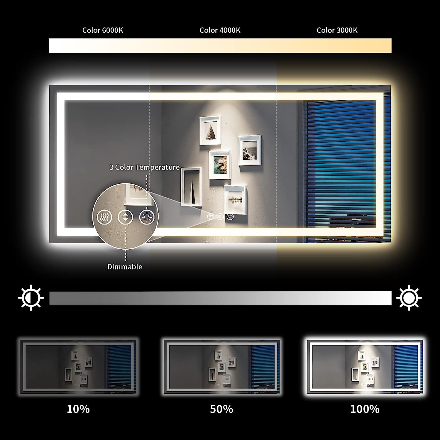 - π‘ Customizable Lighting - Featuring three touch buttons, you can easily adjust the mirror's lighting according to your needs. Short press the 'Light' button to switch between white, natural, or warm light. Long press the 'Brightness' button to adjust the brightness level from 10% to 100%. It even has a smart memory function, which retains your previous settings even after being turned off.